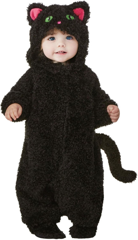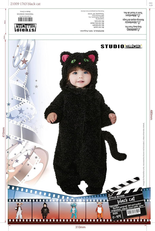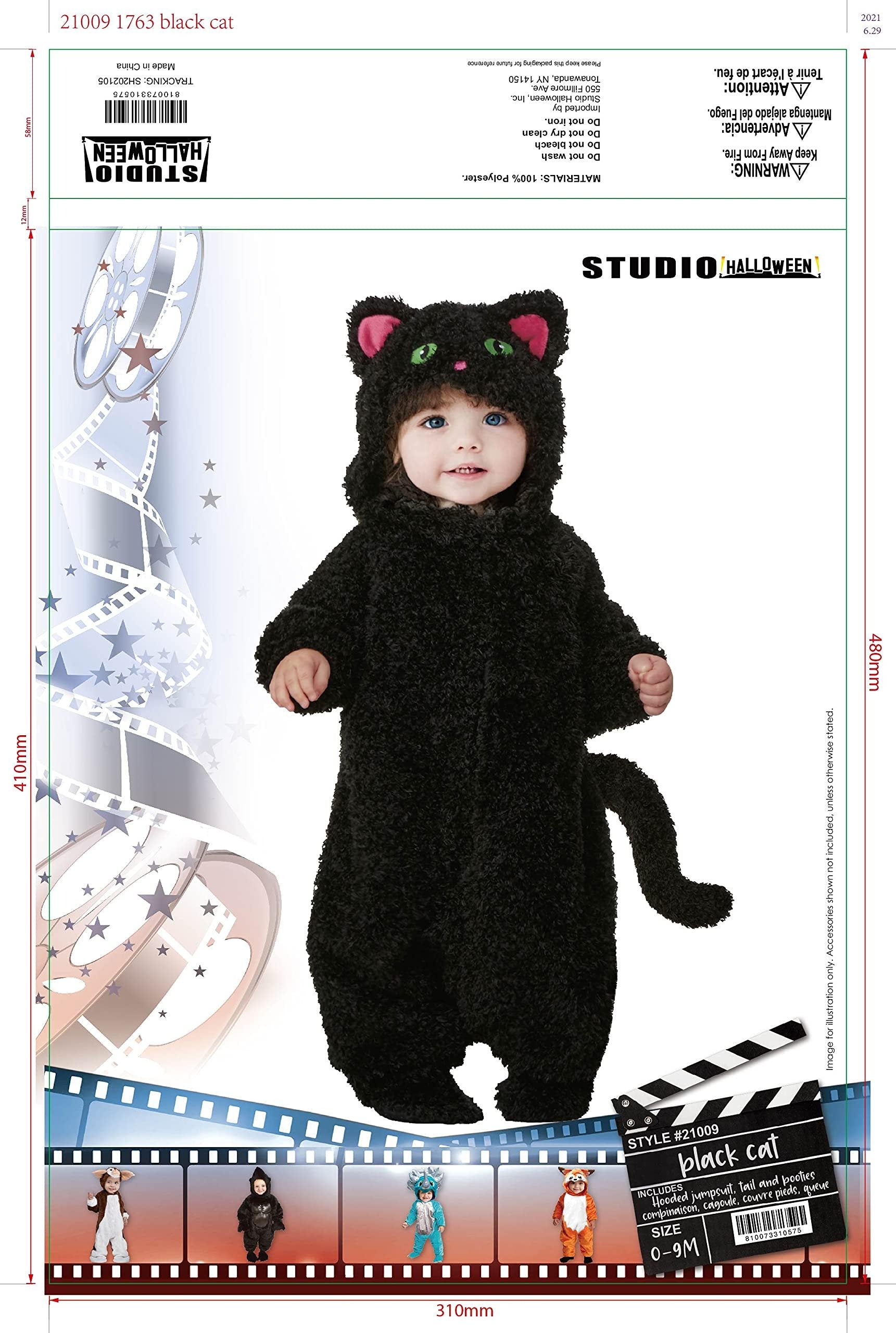 When your little one wants to be a cute black cat for Halloween, why not let them? Black cats hold a special place in the history of Halloween and have become a classic icon and companion of witches. This black cat costume is perfect for little ones with an inquisitive nature about them. Costume includes hooded jumpsuit, tail, and booties. This is great on its own, but would be even better with the other costumes and accessories available in our store.Brand new Fantastic Quality Classic Standard Cat costumeChild Size Child's Newborn (0-9 Months) - Up to 26" height - 18" waist - 18" hip - 7" inseam - 18" chest. All measurements provided by Studio Halloween are approximate.This posting includes: Hooded jumpsuit, tail, and booties as featuredPlease note that only the items listed above are included Brand new Fantastic Quality Classic Standard Cat costume Child Size Child's Newborn (0-9 Months) - Up to 26" height - 18" waist - 18" hip - 7" inseam - 18" chest. All measurements provided by Studio Halloween are approximate.