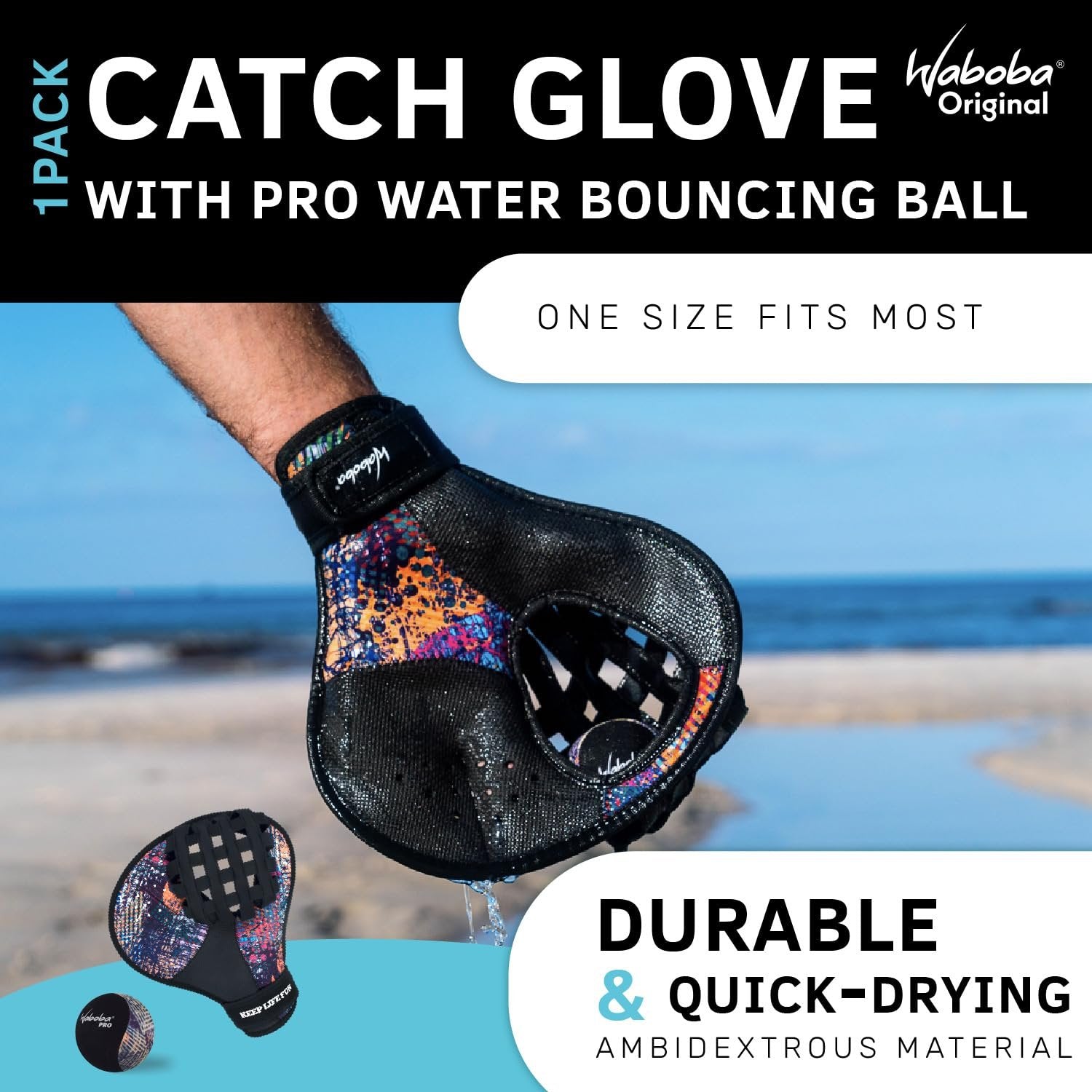 Waboba Water Pro Catch Glove & Pro Water-Bouncing Ball Set – Ball Catching Baseball-Style Mitt for Swimming Pools & Beach Games, Ambidextrous Design, One Size – Black/Multi Colour,121C06