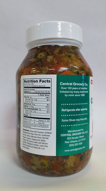 Experience the true taste of New Orleans with Central Grocery's Muffuletta Olive Salad, the authentic Italian olive salad that has made Muffuletta sandwiches famous. Located in the heart of the French Quarter, Central Grocery has been a culinary landmark since 1906. Salvatore Lupo, a Sicilian immigrant, created the original Muffuletta, and this olive salad is an essential part of that iconic sandwich. Made with a delicious blend of olives, pimentos, cauliflower, carrots, celery, Kalamata olives, red bell peppers, capers, and a savory oil blend, this 32oz jar of olive salad is perfect for crafting your own mouthwatering Muffuletta sandwiches at home. The combination of these premium ingredients creates an irresistible flavor that captures the essence of Creole cuisine. Whether you're a fan of Muffuletta sandwiches or want to add a taste of New Orleans to your favorite dishes, Central Grocery's Muffuletta Olive Salad is a must-have pantry staple. Elevate your culinary creations with the same Italian Olive Salad that has delighted taste buds for generations. Order your jar today and savor the authentic flavors of Central Grocery.Authentic Italian Olive Salad from Central Grocery, the Home of the Original Muffuletta.Perfect for crafting your own delicious Muffuletta sandwiches at home.Made with olives, pimentos, vegetables, and a savory oil blend for an irresistible flavor.32oz jar provides ample olive salad for multiple sandwiches or recipes.Ideal for adding a taste of New Orleans to your culinary creations.This olive salad features high-quality ingredients for an authentic experience.A must-have ingredient for lovers of Muffuletta sandwiches and Creole cuisine. Authentic Italian Olive Salad from Central Grocery, the Home of the Original Muffuletta. Perfect for crafting your own delicious Muffuletta sandwiches at home.