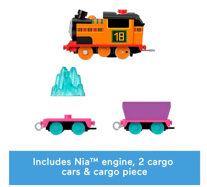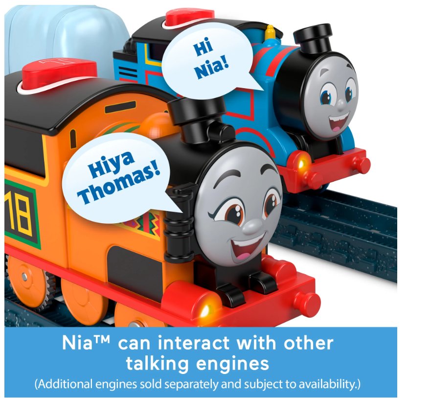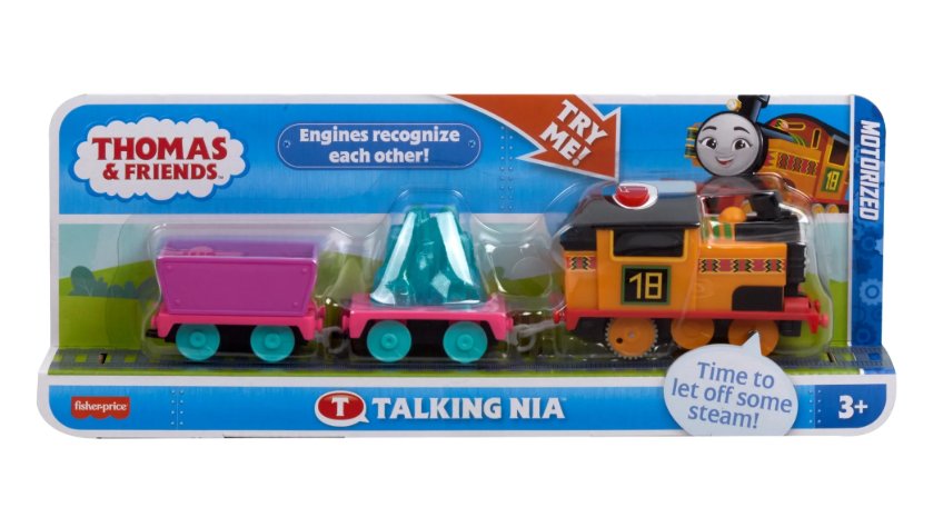 Talking Nia Motorized Train – Bring Nia to life with this battery-powered engine from Thomas & Friends! Hear fun phrases, character sounds, and music that spark imaginative railway adventures. When one talking engine meets any of the others, the characters will recognize and talk to each other! (Each sold separately and subject to availability.)