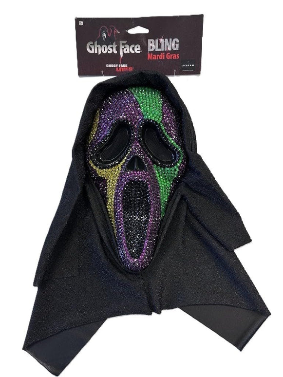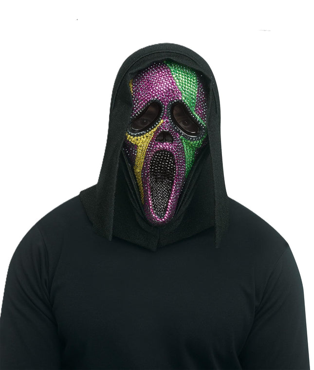Bling and Scream: This Ghost Face Scream Mask with Bling takes the chilling allure of Ghost Face and adds a touch of Mardi Gras flair with rhinestones in the traditional colors of purple, green, and gold. Stand out in the crowd with this unique and eye-catching mask.