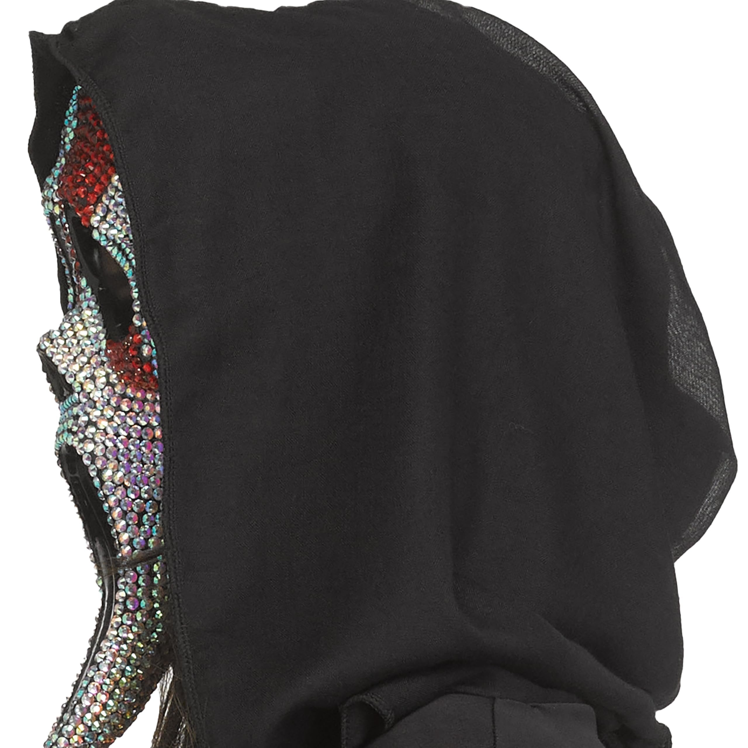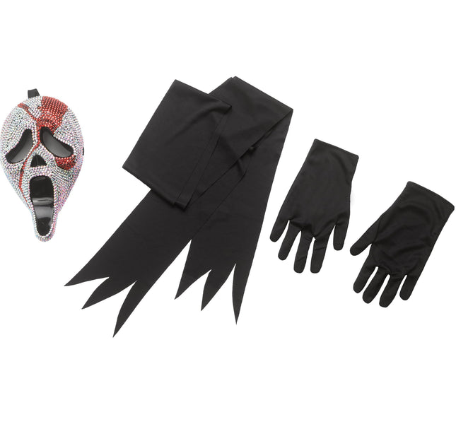 Elevate your Halloween with the Fun World Women’s Ghost Face Bloody Bling Costume, a fearless blend of fright and fashion. Designed for women size L, this hauntingly chic ensemble includes a flowing hooded gown with tattered accents, a coordinating belt to accentuate your waist, elegant gloves, and a dazzling rhinestone-encrusted mask that gleams with eerie red “blood” details.