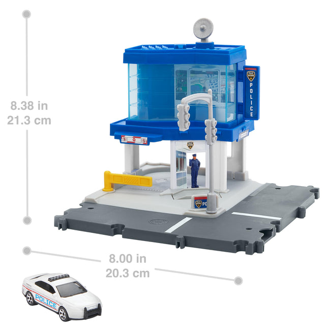 Matchbox Toy Car & Playset, Action Drivers Police Traffic Center with 1:64 Scale Ford Police Interceptor Toy Car, Kid- & Car-Activated Features, Moving Figure, HRY44Keep the Matchbox community moving at the Action Drivers Police Traffic Center.The set features kid- and car-activated features like a rotating satellite that changes the control room monitor and a figure that moves when a vehicle approaches.A 1:64 scale Matchbox Ford Police Interceptor that looks just like a real-life police car.Connect the Police Traffic Center to other Matchbox and Hot Wheels sets for open-ended play. (Additional sets sold separately.)Makes a great gift for kids 3 years old and up. Keep the Matchbox community moving at the Action Drivers Police Traffic Center. The set features kid- and car-activated features like a rotating satellite that changes the control room monitor and a figure that moves when a vehicle approaches.
