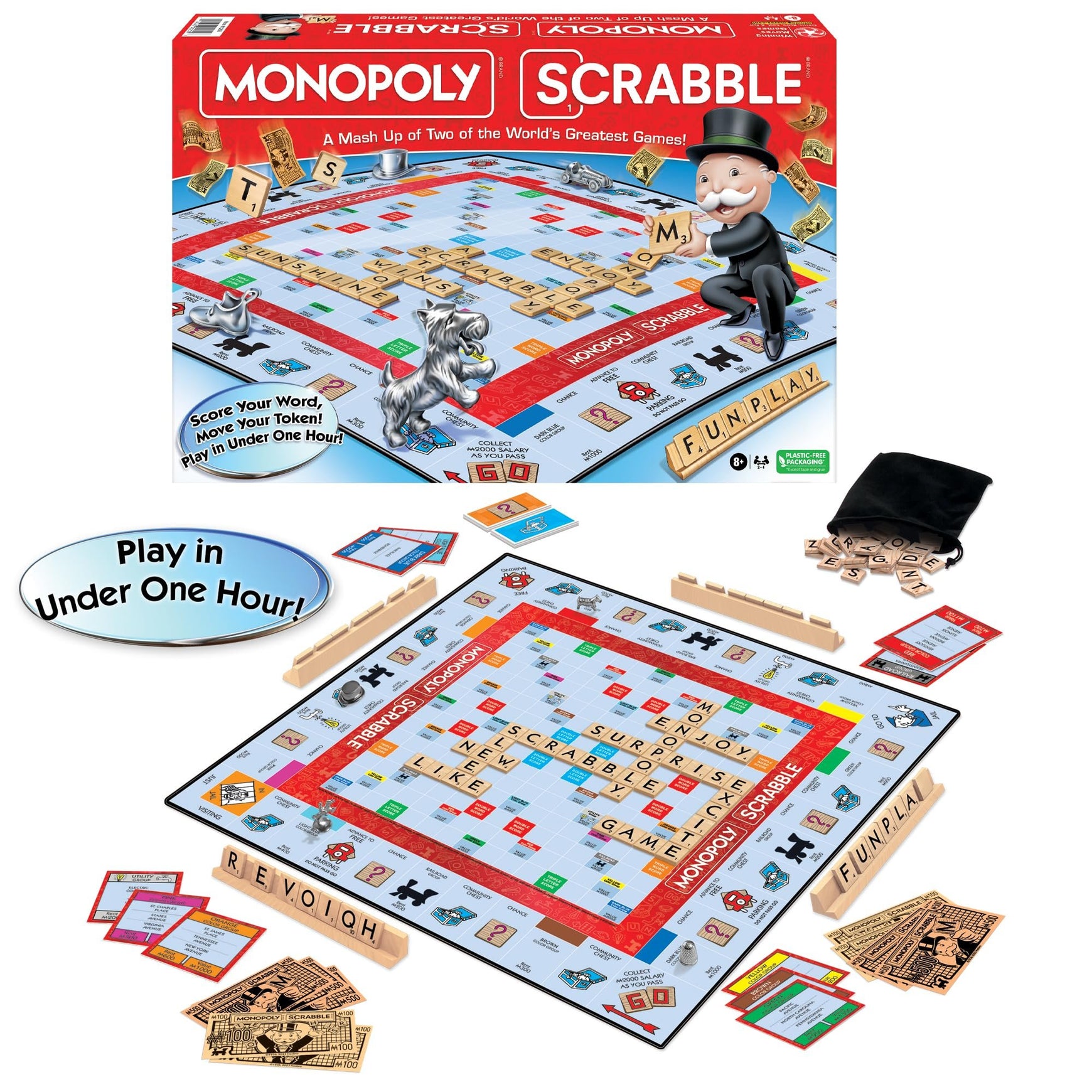 Winning Moves Games USA Monopoly Scrabble Board Game Mash-Up for 2–4 Players Ages 8+, Play in Under One Hour (1250)